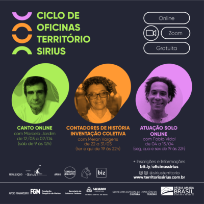 O Ciclo de Oficinas Território Sirius reúne três diferentes artistas que irão proporcionar o compartilhamento de conteúdos criativos e técnicos que integram a programação, entre eles: “Contadores de História – Inventação Coletiva”, com Meran Vargens; “Canto On-line”, com Marcelo Jardim e “Atuação Solo On-line”, com Fabio Vidal. O projeto ainda apresentará lives com os ministrantes, integradas às oficinas, nos dias 7, 14 e 21 de março, às 19h, por meio do perfil do Instagram do Território Sirius (@siriusterritorio).